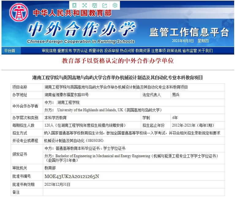 -- 2012年,获批与英国高地与岛屿大学合作举办机械设计制造及其自动化专业本科教育项目