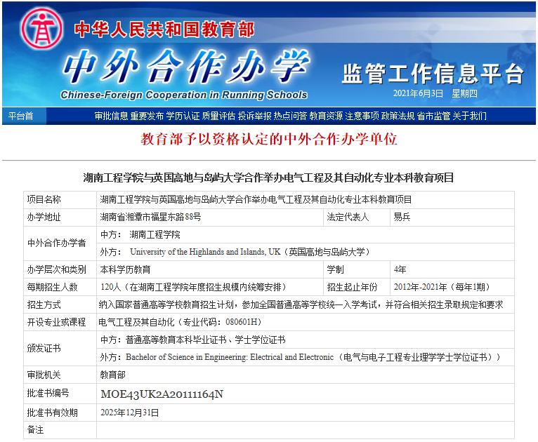 --2011年,与英国高地与岛屿大学合作举办电气工程及其自动化专业,是湖南省第一批获得教育部批准的本科中外合作办学项目