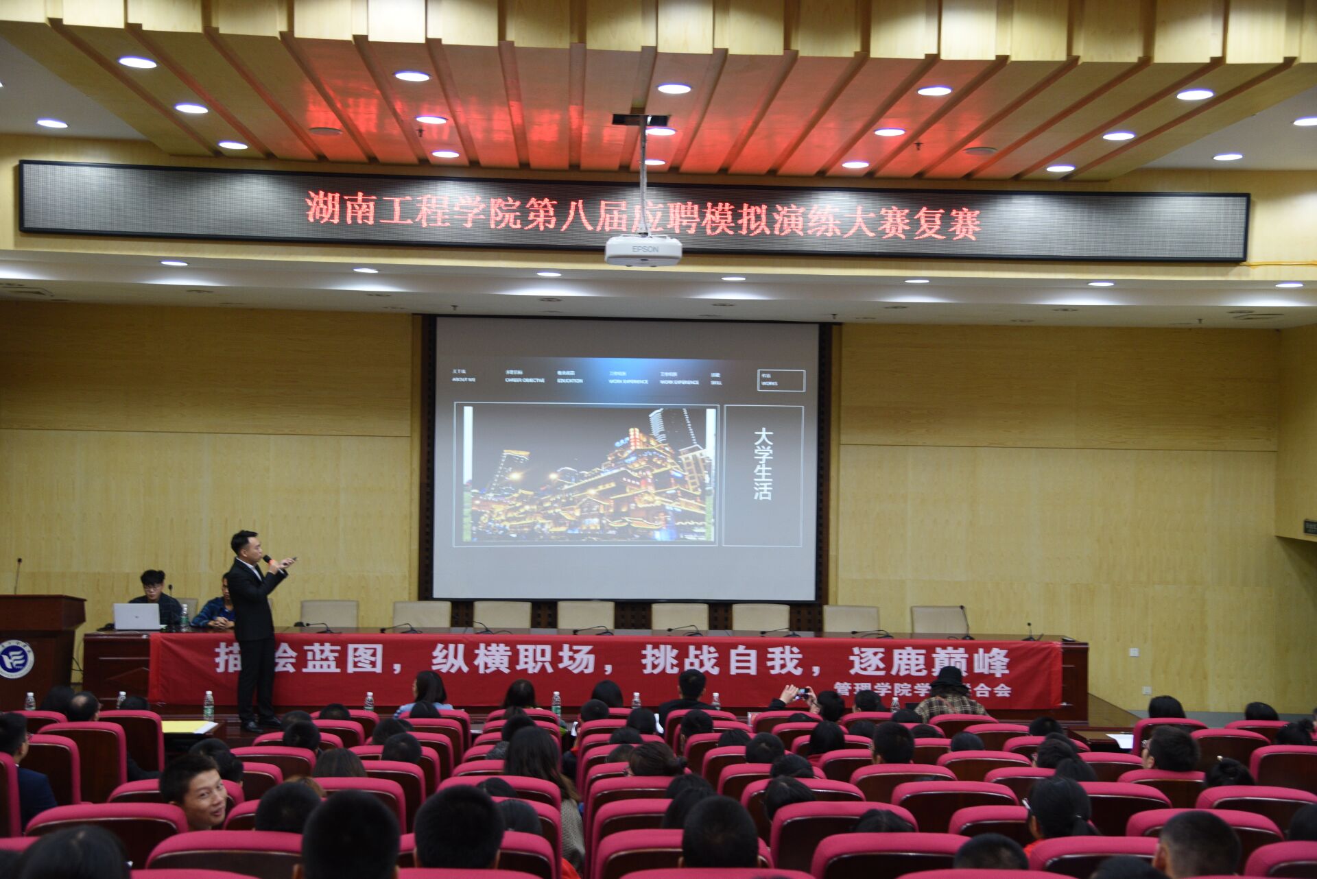 此次比赛分为个人风采展示、观众互动、复活赛三个环节。个人风采展示环节中,选手们选用自己擅长的方式向评委们展示自己。他们借助制作精良的PPT和流利的口才,从个人基本信息、目标岗位、荣誉奖项、实习收获、未来职业规划等方面介绍自己,努力在这一环节抓住评委们的心。小组展示结束后,评委就该组的现场表现指出个人存在的问题并给予了相应的意见指导,选手们虚心求教,受益匪浅。在工作人员统计分数的间隙,主持人组织观众进行现场互动,观众们反应迅速,现场气氛活跃。