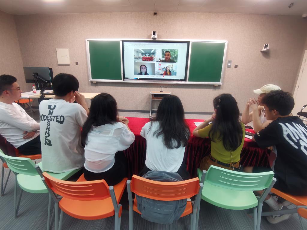 自由交流环节,双方同学还聊起各自喜欢的运动、书籍、游戏等话题,不知不觉一个小时的交流活动就接近尾声。最后,双方同学都表示对下一次交流充满期待,并邀请对方待疫情稳定之后开展互访交流。