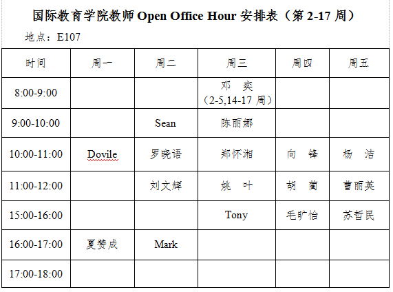 为加强师生交流,帮助员工在学业、生活和人生规划等方面更好地发展,形成有温度的、全员全方位全过程育人的文化氛围,学院决定从2018年9月10日开始实施“面对面开放交流”(Open Office hour)制度。现将本学期教师“面对面开放交流”(Open Office Hour)时间公布如下,欢迎同学们与老师进行面对面沟通交流。