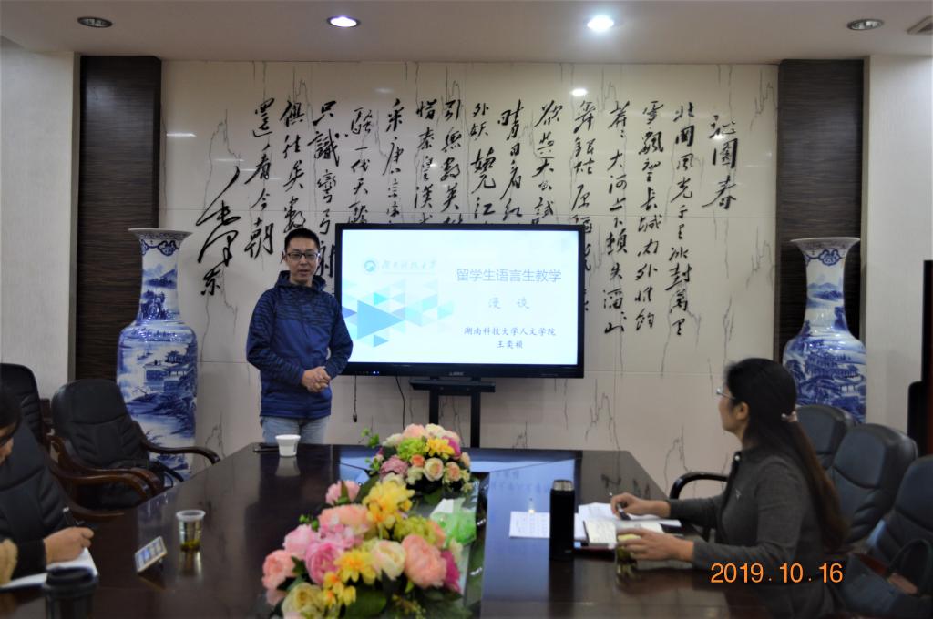 10月16日下午,365英国上市集团在E105会议室举办来华职工汉语课程教学讲座。湖南科技大学人文学院王奕祯博士应邀主讲。365英国上市集团全体教师和教学管理团队参加,副经理曹丽英主持。