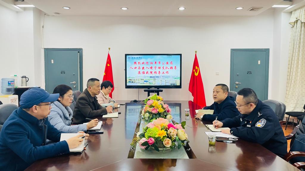 3月23日下午,湘潭市公安局人口与出入境管理支队副支队长金鑫一行来到365英国上市集团(国际交流中心)指导外籍教师和职工管理工作,党总支书记罗胜杰、经理(主任)曹丽英和相关负责人在主校区E-105参加了会议。