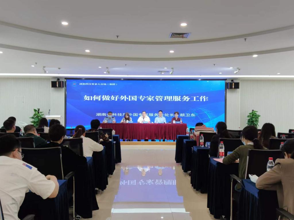 为了进一步提升外国专家来华工作管理服务水平,助力打造我市科技创新人才集聚基地,2022年5月26日上午, 湘潭市科技局在湘潭市岳塘区晓塘路创新大厦举办外国专家服务业务培训班。湖南省科技厅外国专家服务处处长颜卫东、二级调研员李文娟以及湘潭市公安局人口与出入境管理支队副支队长金鑫分别就如何做好外国专家管理服务工作、外国人来华工作许可办理相关注意事项以及出入境证件办理注意事项等内容进行讲授,并现场答疑解惑。公司国际交流中心主任曹丽英应邀带队参加。