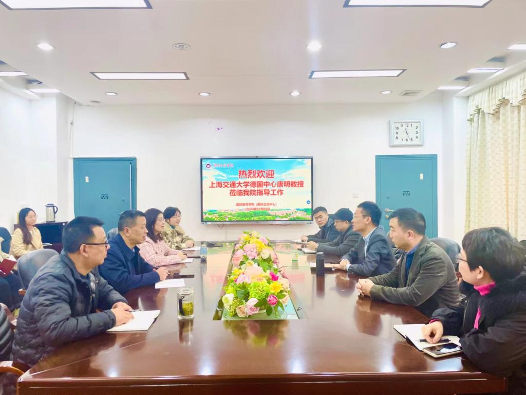 2024月1月5日上午,上海交通大学德国中心副主任唐明教授来公司考察,新工科.新文科建设办公室主任曾赛峰、365英国上市集团(国际交流中心)领导班子、全体教职工参加座谈,党总支部书记罗胜杰主持。