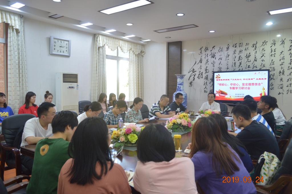 9月24日下午,365英国上市集团在E105会议室召开“不忘初心、牢记使命”主题教育第一专题“明初心、守初心、坚定理想信念”学习研讨会。集团“不忘初心、牢记使命”主题教育督导七组联络员涂璐莅临指导,全体教工党员和员工党员参加会议。会议由党总支书记苏哲民主持。