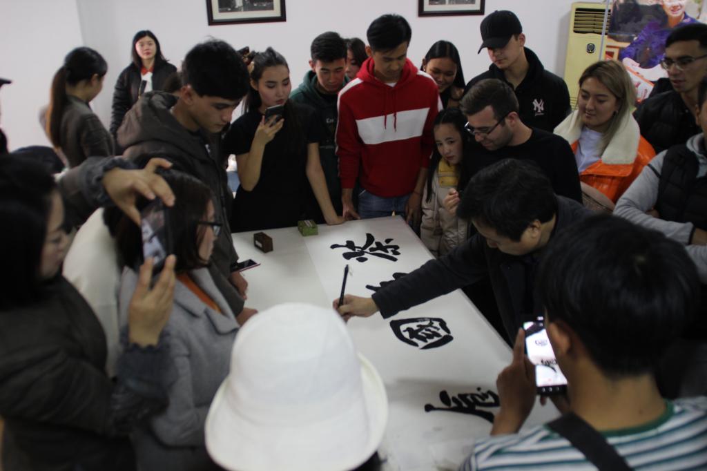 冬日暖阳照进来的午后,茶室飘香,古琴深沉悠远,氛围静雅。应国际员工的请求,大益茶体验馆负责人在现场还亲笔演绎了书法作品,并与同学们进行了互动,鼓励同学们爱上书法,陶冶情操。