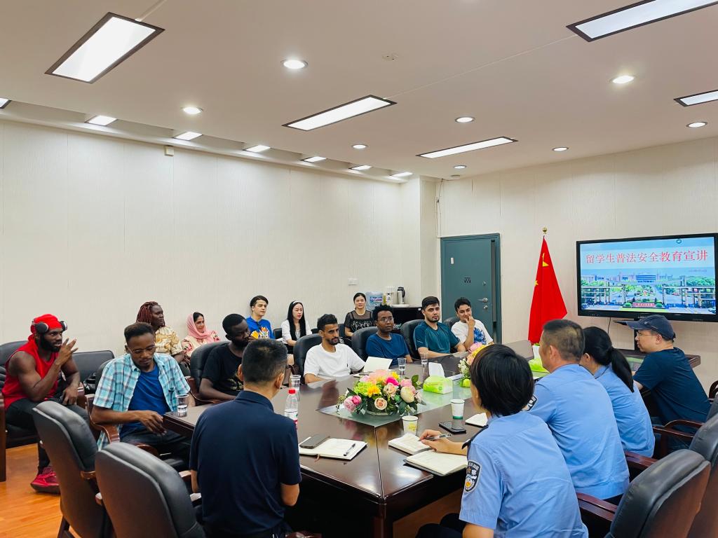 湘潭市公安局出入境支队杨警官基于《中华人民共和国外国人入境出境管理条例》,结合相关案例进行讲解,强调住宿登记、签证居留许可的受理、审批和签发办理等事项,以及外国人在中国非法居留、非法打工的注意事项;岳塘区公安局外管郭警官补充了职工要避免签证过期及非法就业等问题,特别强调了职工个人非法就业和介绍他人就业都属于违法、违规行为;宝塔派出所谭警官详细讲解了《高等学校接受外国职工管理规定》,提醒职工在华期间要严格遵守中国的法律法规和校纪校规,提高安全防范意识,尤其注意防火、防盗、防诈骗;职工办公室主任郑怀湘就职工管理工作中的重要细则进行了详细讲解,列举了职工在日常学习及生活中出现的一些问题和注意事项,强调了校纪校规。