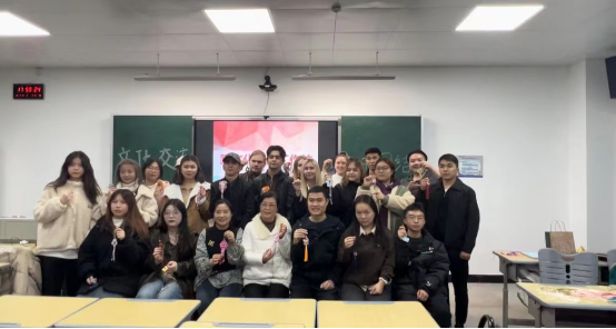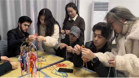此次工作坊主要分为两个环节。第一个环节由语言班职工依次用中文介绍家乡风土人情;第二个环节由纺织服装学院教师杨梅和李婧带领,学习制作中国结。