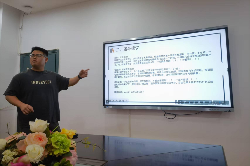 最后,上岸宁波大学机械方向专硕的蔡清霖同学以风趣幽默的风格缓解备考焦虑:“没有科研、比赛经历不可怕,敢拼敢闯的心才是制胜法宝”。他建议暑假留校养成规律作息,并详细分享了英语、数学、政治等学科的备考建议,并强调“练习时不必过度追求正确率,保持稳定心态更重要”。