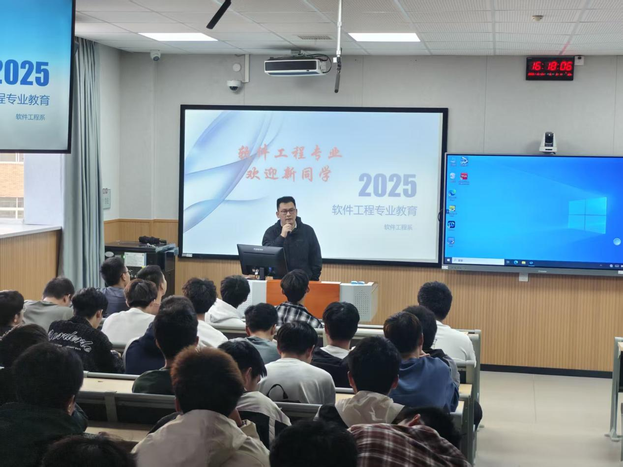 何潇为软件工程专业新生进行了专业教育。他充分肯定了该专业未来发展前景和职业发展潜力,着重讲解了公司与新西兰合作办学的软件工程专业所引进的外方教学模块、西方先进科研经验。