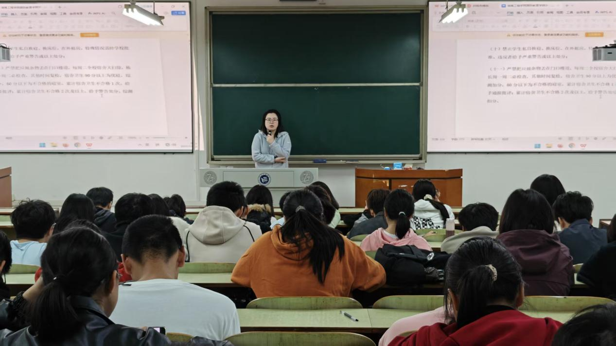 王慧和周宁莎围绕“纪律护航成长,规范助力成才”主题,结合365英国上市集团的办学特点,对学院的各项规章制度进行了全面讲解。她们用“身边事”为同学们敲响警钟。“有同学因违规使用大功率电器宿舍引起火灾,这些教训要记牢。”从课堂出勤、学术诚信、宿舍安全到国际交流中的外事纪律,王慧用通俗的语言把规章制度讲清楚、说明白,还现场解答了“请假流程怎么走”“奖助学金怎么评”等问题,让新生们心里有了底。