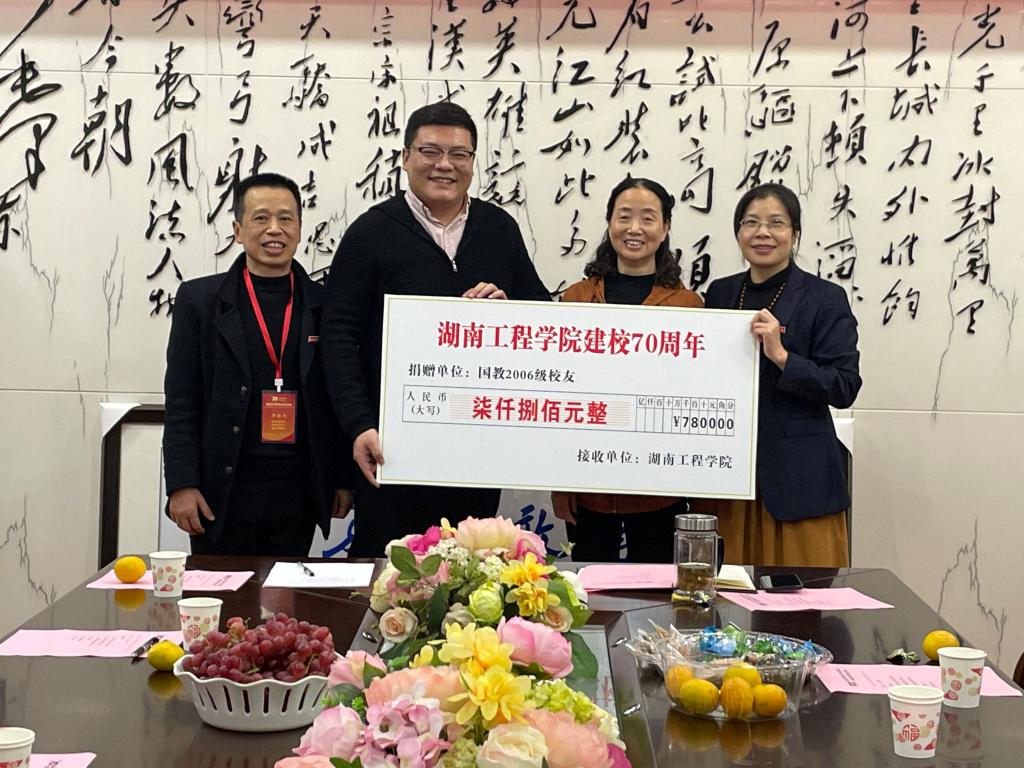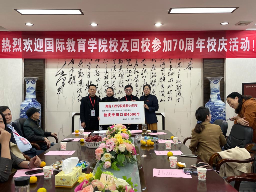 “拳拳学子心,浓浓母校情”。得知母校七十华诞,员工们早早为母校献上爱心。会上,学院为员工举行了隆重而简朴的捐赠仪式。在2004级员工赠送“锲而不舍 敢为人先”的校训苏绣、商英1311班王国铮员工赠送为母校特别订制的校庆专用口罩时,罗胜杰深情地说:“这不是简单的苏绣和口罩,他们绣的是爱心,缝的是情义”。